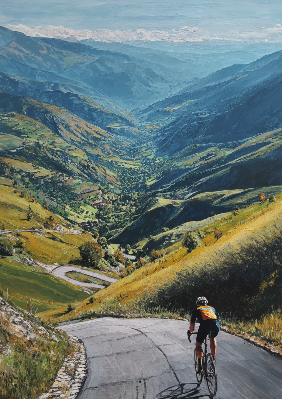 Dynamik und Bewegung eingefangen: Ein Radfahrer bezwingt einen kurvigen Bergpass – jede Serpentine ein kleiner Sieg.